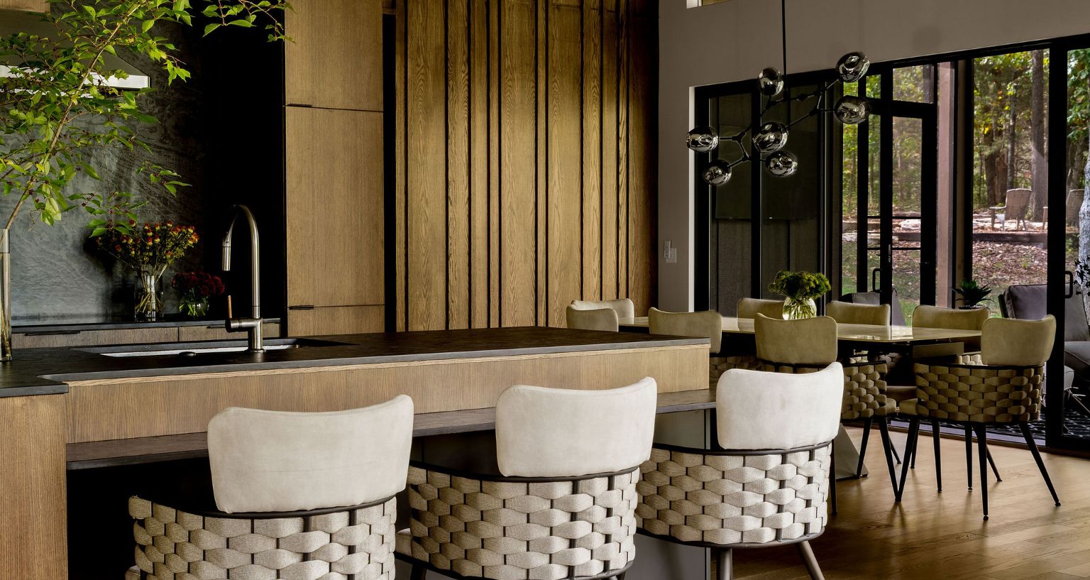 Concepts By Design presents a stunning modern kitchen where nature flows indoors. Warm natural wood cabinetry pairs with rich black accents for bold contrast. Expansive views and organic textures create a seamless indoor-outdoor feel, blending beauty and function into a sophisticated space designed for connection, light, and everyday living.